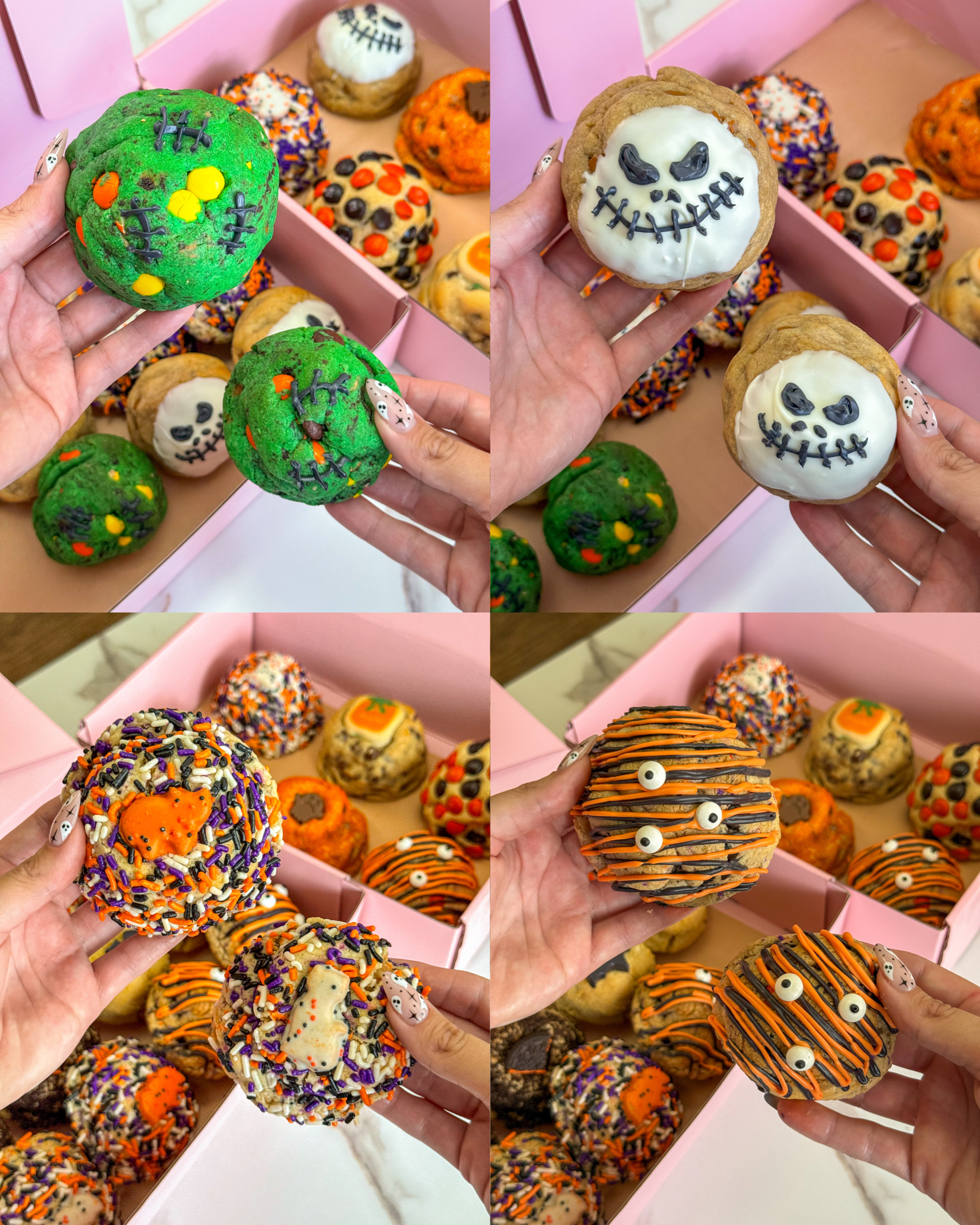 Monster Mash- Vanilla dough mixed with Halloween Oreos, M&Ms, and sprinkles topped with white chocolate and candy eyes